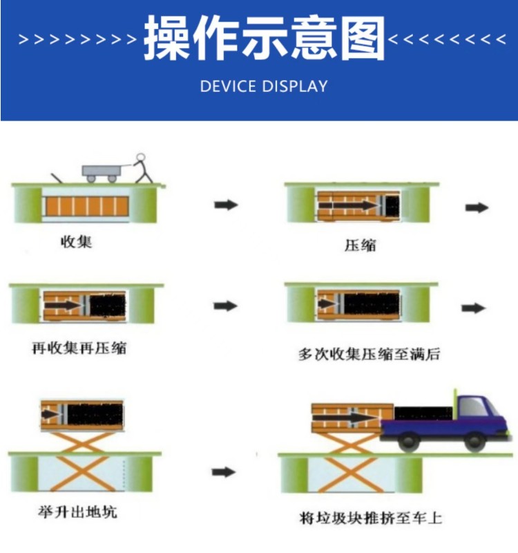 水平式生活垃圾壓縮中轉(zhuǎn)設(shè)備是將垃圾的卸(出)料、壓縮、儲存集合在一起,整體落于地下,利用地下空間將垃圾密閉在箱體內(nèi),地面上無垃圾外露現(xiàn)象,壓縮垃圾產(chǎn)生的污水經(jīng)排污管道直接流入污水井內(nèi),然后由污水泵排到城市污水管網(wǎng),徹底解決了垃圾在收集、儲存、裝運(yùn)過程中的污染環(huán)境、作業(yè)效率低等問題。