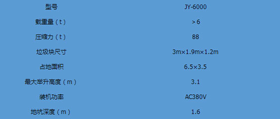 地埋式垃圾中轉站主要特點:1.平穩可靠:兩側舉升,剪叉跨度大,升降平穩,無傾斜。2.全封閉水平壓縮:垃圾壓實密度≧0.86t/m,大幅度節約轉運成本。3.淺地坑:地坑深度僅為1.55m,保潔及維修極為方便。4.高效率:壓實每噸垃圾時間≤10min。 主要技術參考:型號JY-6000載重量(t)>6圧縮力(t)88垃圾塊尺寸3m1.9m1.2m...