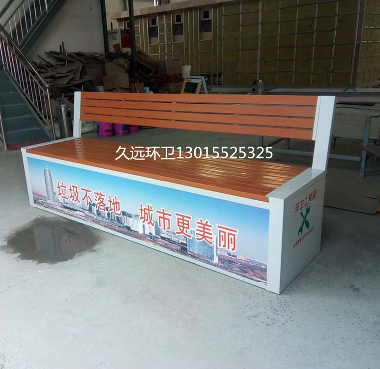 環衛工具箱:也叫保潔員工具箱,環衛工具座椅,保潔員休息座椅,市政保潔箱等。工具箱常用尺寸為:長2400*寬500*高550mm,也可以做成2米,2.4米,2.7米等,寬度和高度也可以定做,滿足不同客戶、不同場所的使用要求。